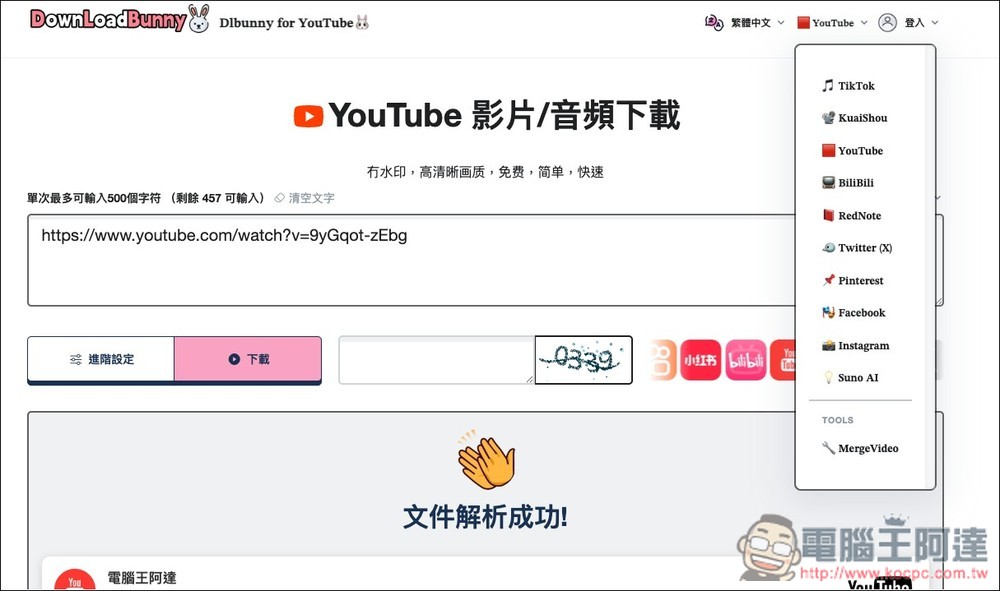 跟其他下載工具不同,DownLoadBunny 是一款支援多平台的影片下載工具,從常見的 YouTube、TikTok、Facebook、Instagram,到中國的 Bilibili 網站都支援。操作簡單,貼上網址並輸入驗證碼後就能獲得載點。對於想要下載高畫質,但影片可能沒有聲音的情況,也提供影片和音訊合併的線上工具,這相當方便,有需要的人推薦收藏起來。