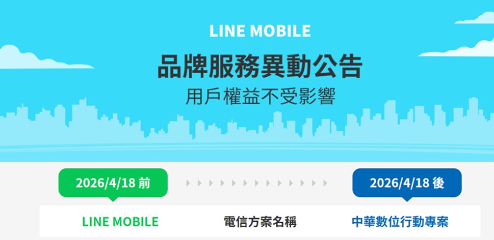 LINE與中華電信宣布Line Mobile 5G服務將於2026年4月17日結束品牌合作,屆時將關閉官方帳號,並邀請用戶加入「中華電信LINE官方帳號」接棒服務;4月18日起將更名為「中華數位行動專案」,中華電信將持續提供電信服務,既有門號相關行動上網、語音及月租費等資費方案約期內搭贈的LINE POINTS、LINE貼圖、鈴聲等攸關客戶權益優惠,均不受影響。凡新申請、攜碼及既有客戶續約LINE MOBILE 5G方案,請務必於2026/4/16前完成門號申辦並啟用。