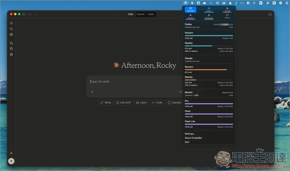 最大的優勢在整合能力,支援多個 AI 平台,包括 Codex、Claude、Cursor、Copilot、Vertex AI 等,透過 OAuth、CLI 或瀏覽器 Cookie 來讀取資料。基本上安裝之後,就直接在 Mac 的選單列看到每個服務的剩餘用量、重置時間,以及目前的使用狀態。這對需要控管成本,或不想突然被限制的使用者來說非常實用。