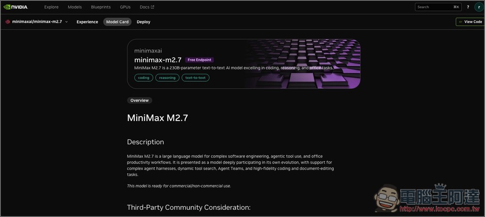 稀宇科技近日開源的 Minimax M2.7 模型,很多人一定都想玩玩看,不僅支援 Agent、工具調用和多任務,更具備「自我演化(Self-Evolution)」的能力,聽起來就相當強,只不過 230B 這麼大的參數量,絕大多數人的電腦一定跑不動。而這篇就要來告訴你一個好消息,NVIDIA 的免費 API 就能呼叫這款 Minimax M2.7 模型,而且是完全免費用,無需填寫信用卡,實測可用於 OpenClaw 龍蝦,下面就來教你怎麼做到。