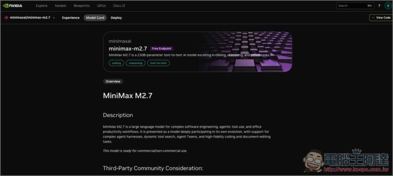 稀宇科技近日開源的 Minimax M2.7 模型,很多人一定都想玩玩看,不僅支援 Agent、工具調用和多任務,更具備「自我演化(Self-Evolution)」的能力,聽起來就相當強,只不過 230B 這麼大的參數量,絕大多數人的電腦一定跑不動。而這篇就要來告訴你一個好消息,NVIDIA 的免費 API 就能呼叫這款 Minimax M2.7 以及剛推出的 GLM 5.1 模型,而且是完全免費用,無需填寫信用卡,實測可用於 OpenClaw 龍蝦,下面就來教你怎麼做到。
