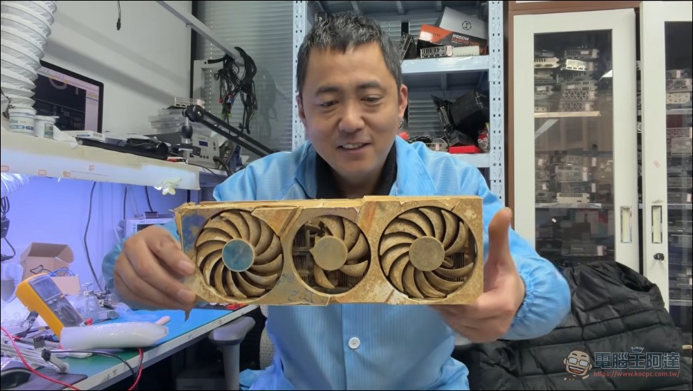 其中顯卡整張卡被泥巴包裹,散熱器與背板都已嚴重鏽蝕。不過張哥發現核心與記憶體顆粒的外觀似乎還算完整,判斷仍有修復機會。