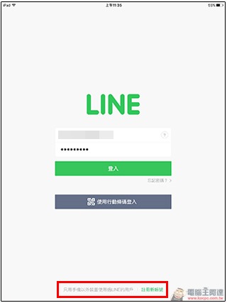 請注意,這裡的「電子郵件登入選項」適用於已於手機上使用的 Line 帳號,若你想在 iPad 上登入的 Line 帳號並沒有在任何手機上使用,則請點選畫面最下面灰色的「只用手機以外裝置使用過LINE的用戶」選項。