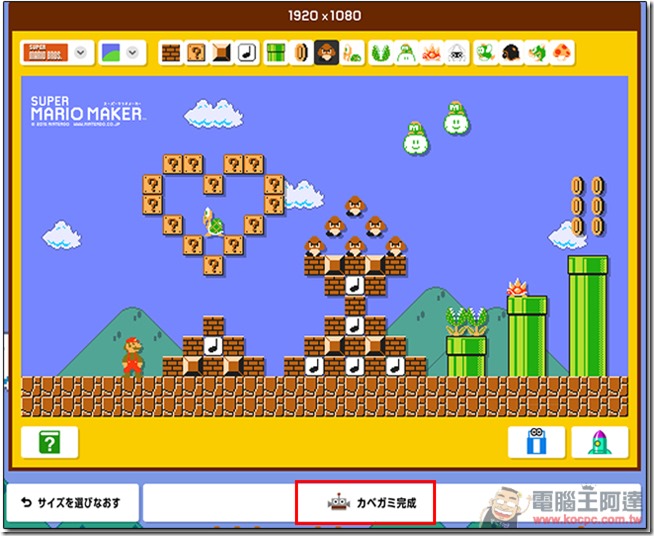 然後就是進入設計環節囉!動手前 C 編先簡單講一下這裡的主要功能鍵,從最左邊開始,第一個是選擇要使用哪一代超級瑪利歐的風格;第二個則是選擇你的關卡所在地理地形,像是水中、地上…等等;其他旁邊的小按鈕就是各種元素隨你添加啦!至於最右邊的香菇只在瑪利歐身上有用,沒錯!就是讓主角長高!而下方右側兩個按鈕,有兩個大眼睛的是橡皮擦功能,點擊後再點要消除的物品即可;火箭圖案則是整個洗掉重置的意思。