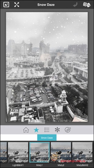 拍完照或把照片匯入後,你可以先選擇喜歡的下雪效果,大約有十幾種選擇,App 會判斷照片的對比以及亮度等,來自動計算每個地方適當的下雪量。