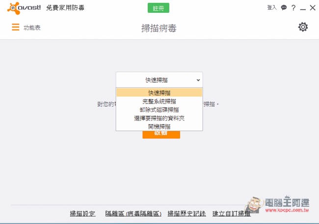 ▲ 掃描病毒功能中也提供五種常用的模式,一般來說快速掃描就已經很足夠了!除非你真的覺得電腦充滿病毒、或是某個資料夾有病毒,才會用到這些模式。