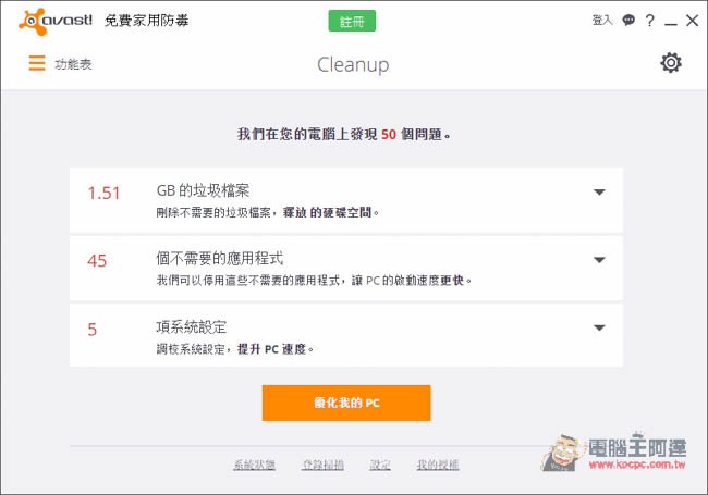 ▲ 而效能問題掃描出的結果,雖然 Avast 提供一鍵優化功能,但這是需要升級成付費版才能使用,真的有需求的朋友可以參考看看。