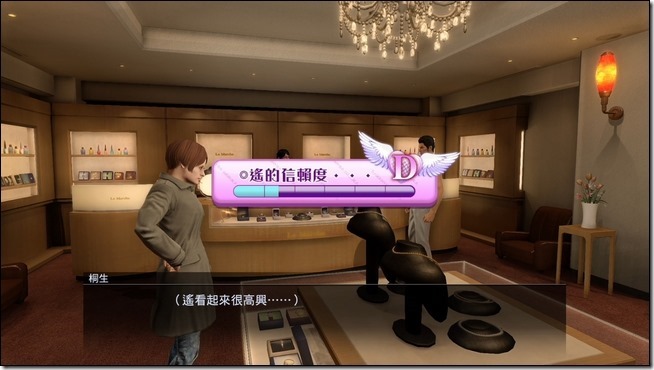 而在本作的漫遊模式中,玩家可以選擇帶著遙一起出門,此時遙就會開始不斷的在旁邊碎念、跟你許願說他要這個要那個的,玩家有興趣的話可以完成遙的願望。跟真島一樣,每次滿足遙的願望時,都會累積好感度,好感度每提升一個等級,遙就會送一些可愛的小東西給玩家作為回禮,完成到最後,是可以解開其中一個獎盃的。只是我說啊,遙你真的很會利用小孩子跟女孩子的身分耶,桐生一個堂堂的硬漢,變成提款機+好人了。