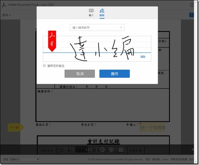 接著會跳出簽名的版位,可以用電腦先輸入文字後,再用滑鼠一筆一畫簽名,簽完後,點選下方的應用就可以了: