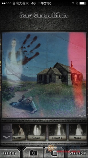Scary Camera Effects 跟一般相機 App 不太一樣,它是一套提供使用者把相片後製成恐怖靈異照片的相機工具,除了內建超過 20 種的恐怖風格濾鏡外,還具備超過 50 種殭屍、靈魂、血手印以及怪物等圖像,讓使用者自由添加,非常的好玩。