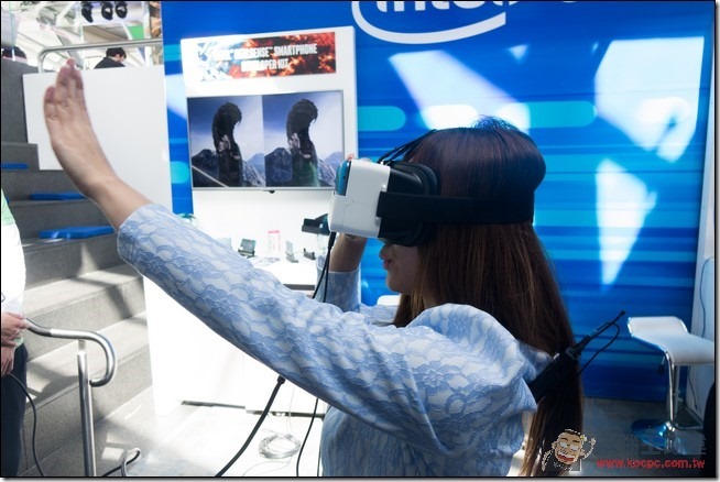 這套名為Realsense的技術模組中,在這次的體驗區可以看到兩種應用,一種是放置在智慧型手機上的模組,Intel這次帶來的是特規的Android系統智慧型手機,與一般智慧型手機不同的地方是,這個手機上總共有六個外顯的鏡頭與感應器,其中已知的是兩組rgb camera鏡頭、一組depth sense Camera距離偵測鏡頭、還有一組紅外線。這款看起來眼睛很多的智慧型手機,如果搭配上Intel推出專用的頭戴式VR裝置,就可以隨即進入到虛擬實境的世界中,而且透過智慧型手機上的鏡頭與感應器模組,其實不需要特別的感應器,伸手就可以在手機螢幕中,看到自己的雙手。