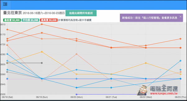而點選上方的去程或回程趨勢功能,會跳到下面這圖表,這邊會利用曲線圖的方式,列出你所選擇的旅行日期(如:6/18~6/23)去程/回程的價格趨勢,而每一條線代表著每一個航班,這邊是用來幹嘛的?無果一開始查詢完後,看到價格似乎不是很優,就可以改用這趨勢功能,來查看 6/18~6/23 的去程哪一天比較便宜、或是回程哪一天比較便宜,進而調整自己的旅行日期。以筆者 6/18 去程為例,如果改成 6/21 出發的話,價格就更便宜了!