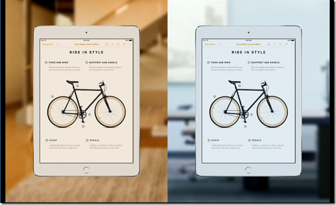 而且神奇的是,這款縮小版的iPad Pro可以模擬白紙,會依照各種不同的環境光,模擬出各種不同的色溫,讓你的設計品在輸出前,可以更準確的判斷顏色,除了設技領域可以用到以外,當拿iPad Pro月讀電子書時,可以針對背景光源作適度的調整,同樣也是可以降低眼睛的負擔:
