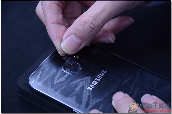 S7 edge 的背殼部分一樣有美麗但刁鑽的彎角與曲面,所以師傅以熱風烘吹的同時,小心翼翼地拉伸、塑形,讓膠膜能夠更完美貼合。