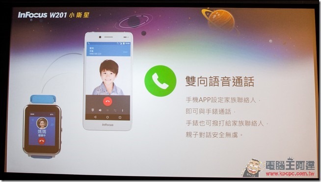 這款InFocus W201 小衛星兒童定位手錶,採用了1.6吋的彩色觸控螢幕,MSM 8208的雙核心處理器,內建有350mAh的電池,同時具備有通話、簡訊功能,讓長輩可以透過語音或簡訊來與小孩子溝通。