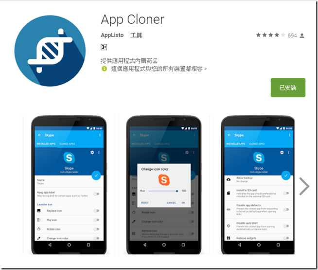 App Cloner是款Android系統的APP,他最主要的功能就是「複製APP」,他可以讓你原本已經安裝好在手機上的軟體,複製一份一樣的APP在手機上。為了避免兩個LINE的圖案顏色太近讓你搞混,免費版本的App Cloner有著幾個貼心的功能,在開始複製之前,App Cloner可以讓你設定被複製出來的APP的圖案方向、顏色、圖案角度,透過這些貼心的功能,可以讓你快速的辨識出這幾個名稱相同的APP中,哪個才是哪個帳號的喔。
