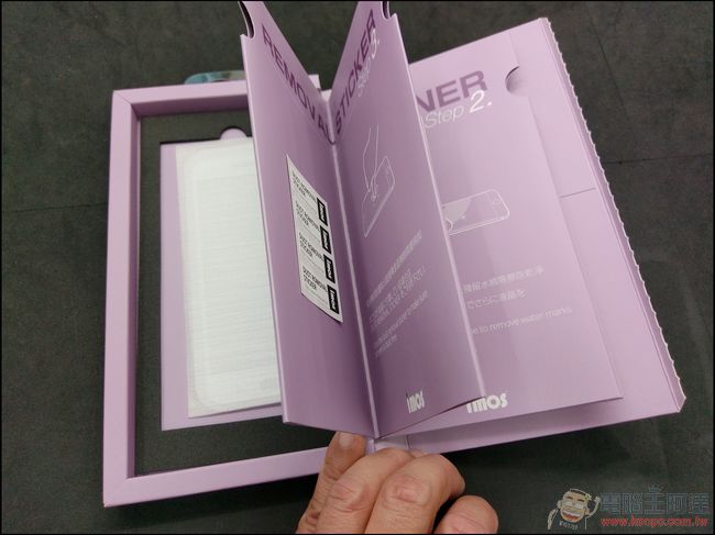 這次螢幕的部分是使用imos的3SAS疏水疏油保護貼,這東西很厲害的,從包裝上的的形象圖就可以看出這款保護貼有極強的聚水效果,水滴到上面很快就會凝結成水珠,減少對於電子產品的傷害。打開包裝後,裡面有螢幕保護貼一片加上輔助安裝組一包。