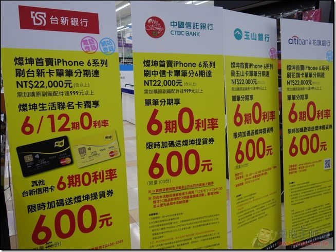 燦坤與台新、中國信託、玉山與花旗銀行合作,推出 6~12期分期 0 利率活動,而且還限時加碼送 600 元燦坤提貨券: