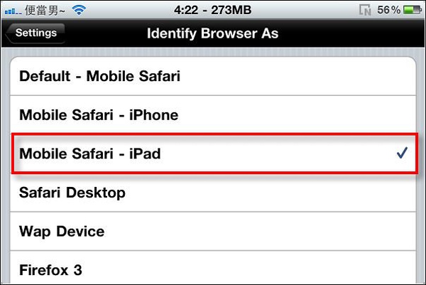 ▲將瀏覽器偽裝成「Mobile Safari – iPad」。
