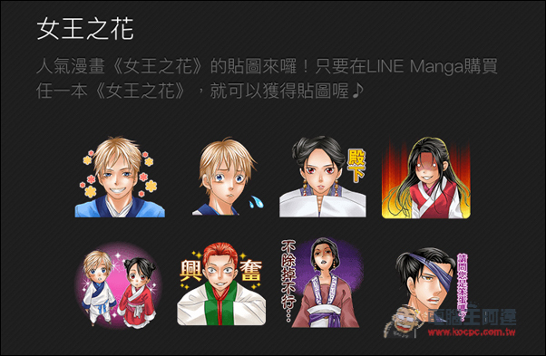 而如果你對漫畫貼圖也有興趣,或無法參與這次「進擊的熊大」貼圖活動的人,在 LINE Manga App 中目前有五套漫畫也有免費贈送貼圖活動,分別是「近距離戀愛」、「女王之花」、「七大罪」、「名偵探柯南」與「花牌情緣」,只要下載免費的第一集漫畫後,即可獲得,而且是無使用期限哦!