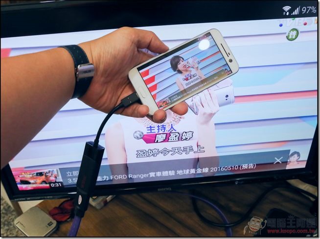 經阿達測試可直接輸出畫面到電視與支援的螢幕上面,連聲音輸出也正常,以後用手機轉到大電視上看影片、或是連接投影機做簡報只要一條線就搞定了,是不是很方便呢: