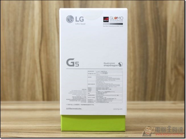 背面上方標註了 LG G5 榮獲了 MWC 2016 年度「最佳新智慧手機」大獎: