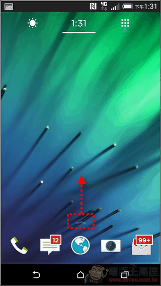 Yahoo AVIATE 桌面原生介面是乾乾淨淨的沒有任何內容,在最上方配置了三個圖示,分別是「情境」、「主頁面」與「程式集」,主頁面的下方則是常用的電話、簡訊、瀏覽器、拍照…等最常用的功能,其實在最左邊的情境與最右邊的程式集還另外有有選項可檢視。在主頁面空白處按住不放就可以更換桌布或新增小工具:
