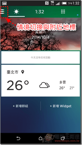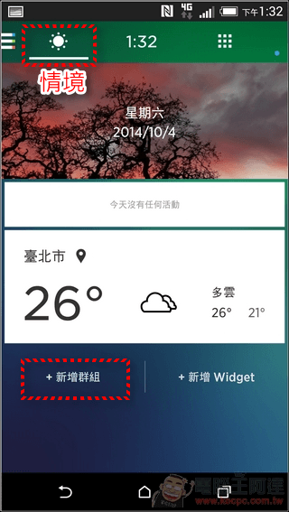 Yahoo AVIATE 桌面最有趣也最實用的就是情境的使切換與使用了,在白天時預設就是「今天」,此時情境會顯示今天天氣、即將進行的活動,阿達則是加入了行事曆小工具,到晚上時會自動進入夜間情境,畫面上顯示的就是設定鬧鐘、請勿打擾等選項,完全依照時間自動切換情境: