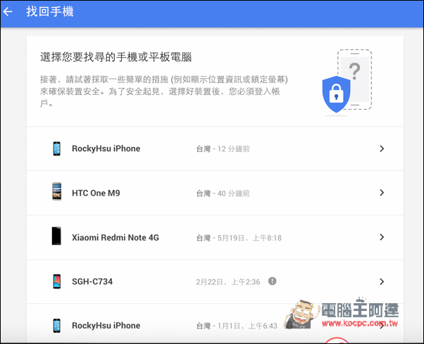 待幾秒鐘就會列出你所有曾登入過 Google 帳戶的手機,除了找回手機外,其實也可以趁這時候整理一下帳戶