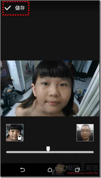 接著再選擇第二張有正面清晰人臉的照片就可以將其混合,下方的拉霸可以決定像誰多一些,我跟我的小女兒混合後竟然幾乎一樣(只差多了眼鏡),果然遺傳不能騙人呀。這個功能可以讓情侶或朋友玩類似黑與白MV中變臉的效果,相當有趣,還可以把結果存成照片或影片: