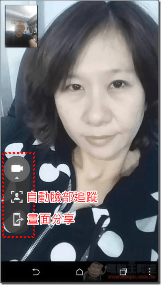 以「自動臉部追蹤」為例,他會自動放大視訊端的人像畫面,以下面為例我開啟了自動臉部追蹤後,我的臉部明顯的被系統放大了,這個功能最多支援四人同時使用並放大,而且受話端不論使用任何手機都可以使用: